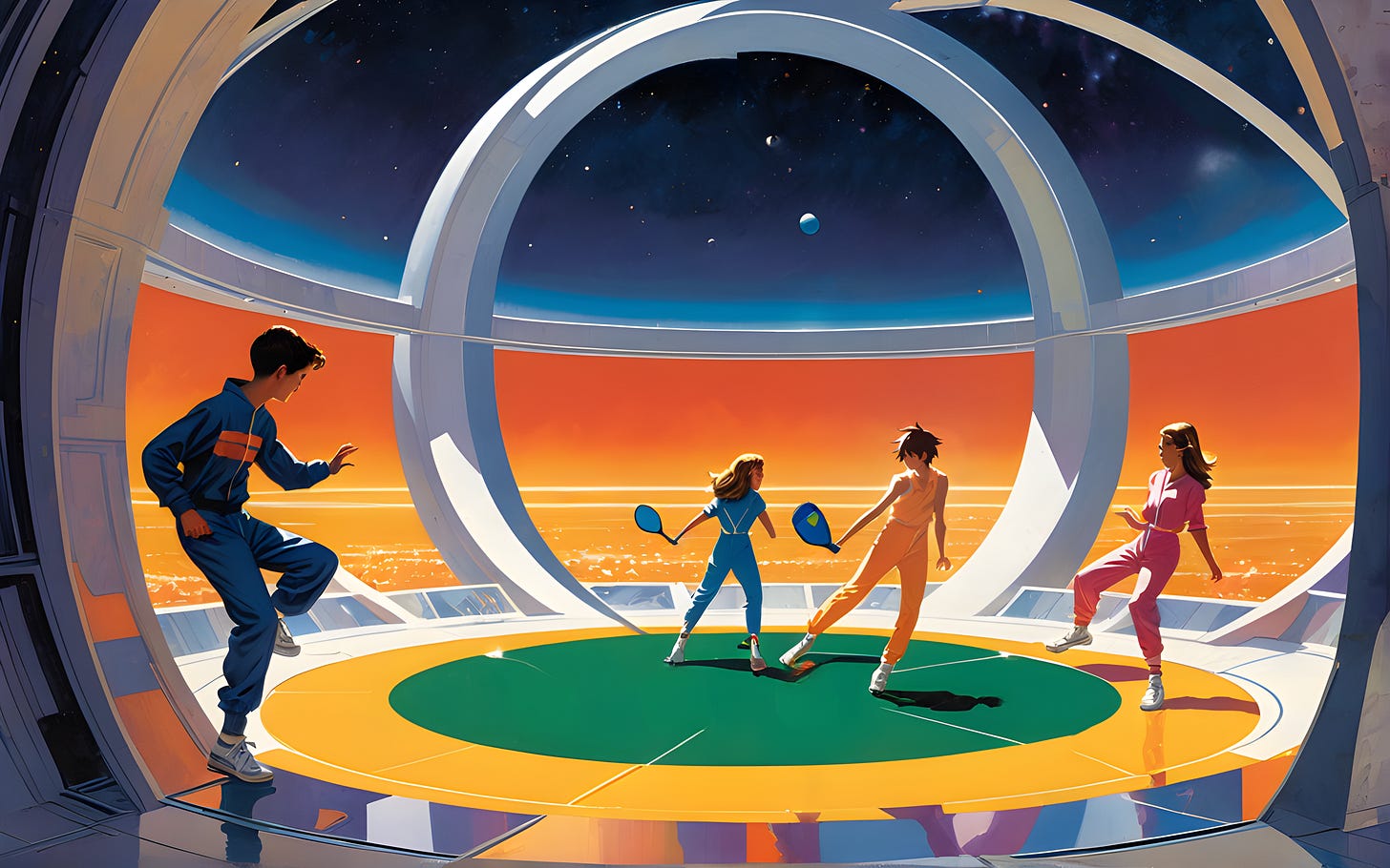 The ball bounced off the concave disc in the center of the room's floor, the shape of the disc naturally returning the ball to play. Aaralyn Roth dove to the floor, her arm outstretched, and whacked the ball with her racquet, sending the ball up toward the concave disc on the ceiling. Aaralyn was teamed up with Lillian Evergreen, a tall fourteen-year-old girl with long blonde hair that had been pulled into a ponytail. Lillian circled the room with long sidelong steps, keeping low to the floor - well, as low as she could in the low gravity of the Taurus 1 station. The girls were opposed by sixteen-year-old twins Silas and Griffin Emberheart. Silas elbowed Lillian as he pushed toward the center of the room, positioning himself to return the next volley.